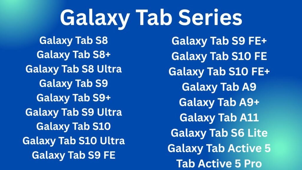 In the Galaxy Tab series, you can see all the major tablets. It includes Galaxy Tab A9 series, Galaxy Tab S8, Tab S8 Plus, Tab S9, Tab S9 Plus, Tab S10 series, Tab Active 5, Tab Active 5 Pro, Tab S9 FE, Tab S10 FE, and many other Galaxy Tabs are part of it.